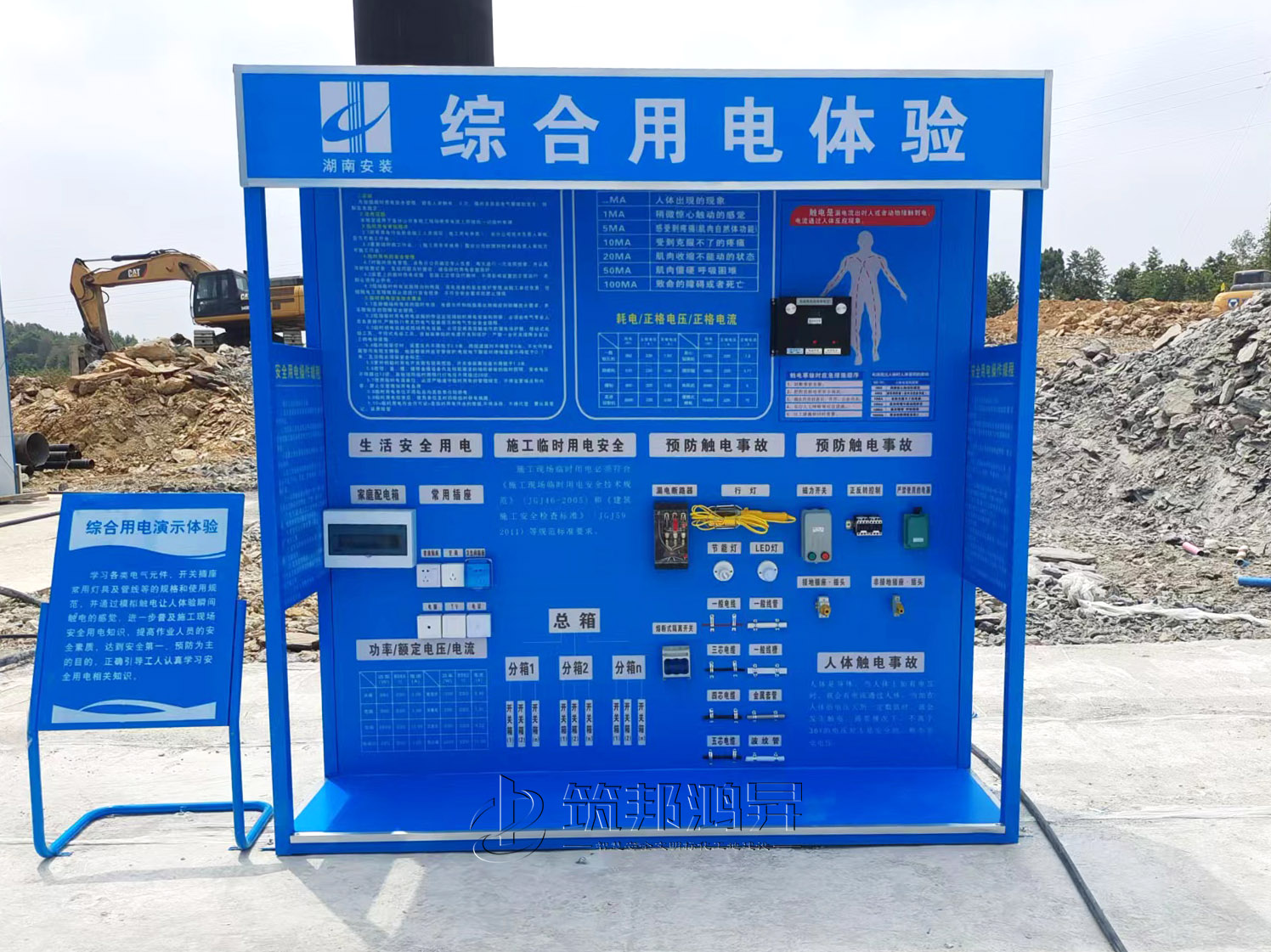 此次合作的安全教育培訓體驗區(qū)建設(shè)包括了綜合用電體驗、安全帽撞擊體驗、班前安全講評臺、平衡木體驗、安全帶使用體驗、滅火器演示體驗、洞口墜落體驗等。標準款采用鋼結(jié)構(gòu)組裝式設(shè)計,高溫烤漆不易褪色,顏色鮮艷更美觀,設(shè)計制作安裝一站式服務(wù)。筑邦安排專車送貨到工地,同時安排專業(yè)的安裝團隊從長沙來到邵陽工地現(xiàn)場,進行專業(yè)安裝。